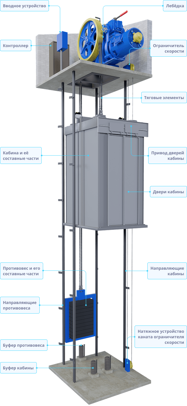 - разводки проводов по машинному помещению, шахте и кабине;